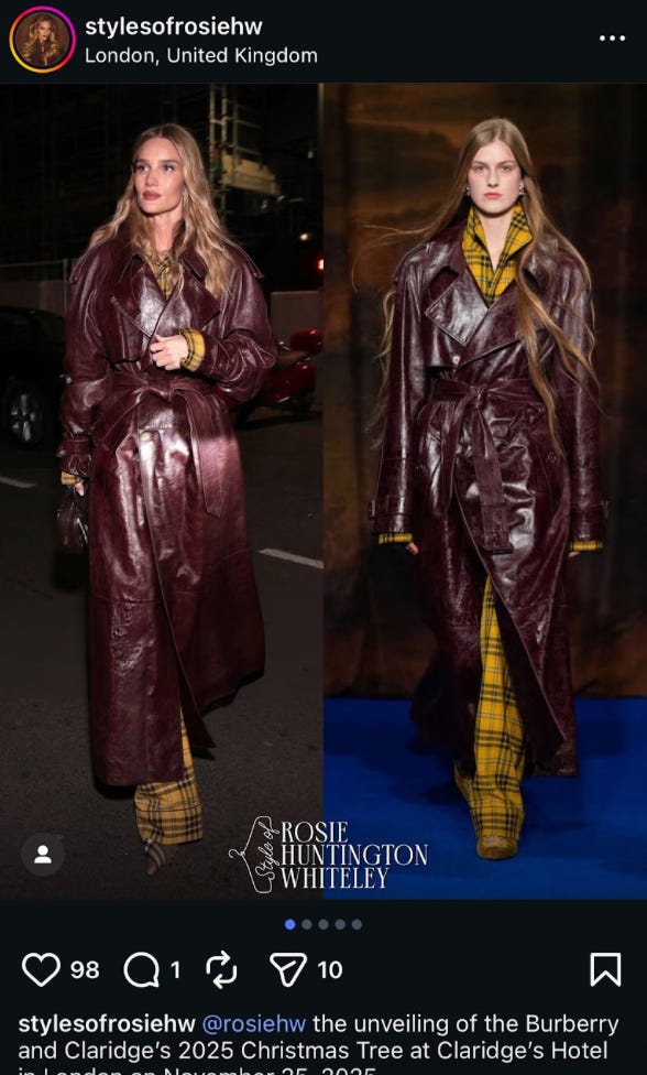 Burberry and Claridge’s 2025 Christmas Tree unveiling brought out a glittering crowd of celebrities, all draped in Burberry. My favourite look by far was Rosie Huntington-Whiteley’s: a rich burgundy leather trench paired with mustard accents that complemented her blonde locks so well.