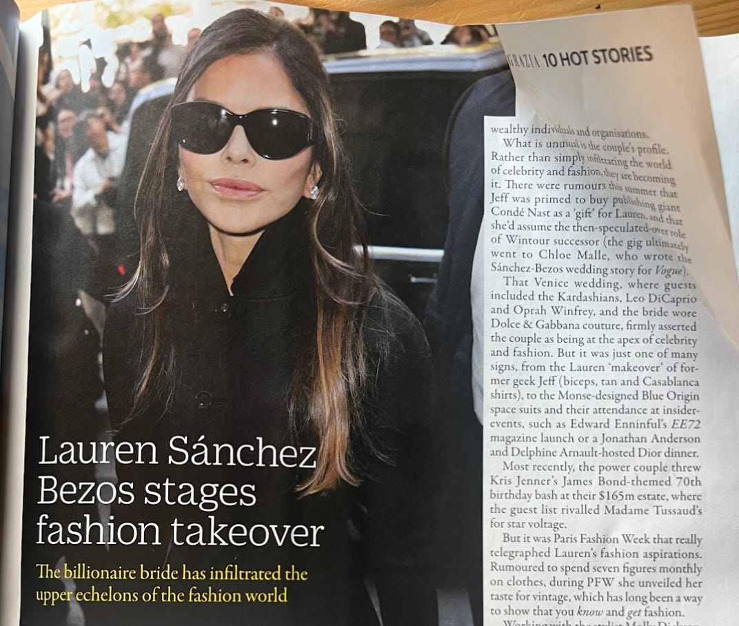 On Tuesday’s train ride home, I devoured the latest issue of Grazia. One piece in particular by Laura Antonia Jordan stood out - an exploration of how Lauren Sanchez Bezos is orchestrating a full-blown fashion takeover.
