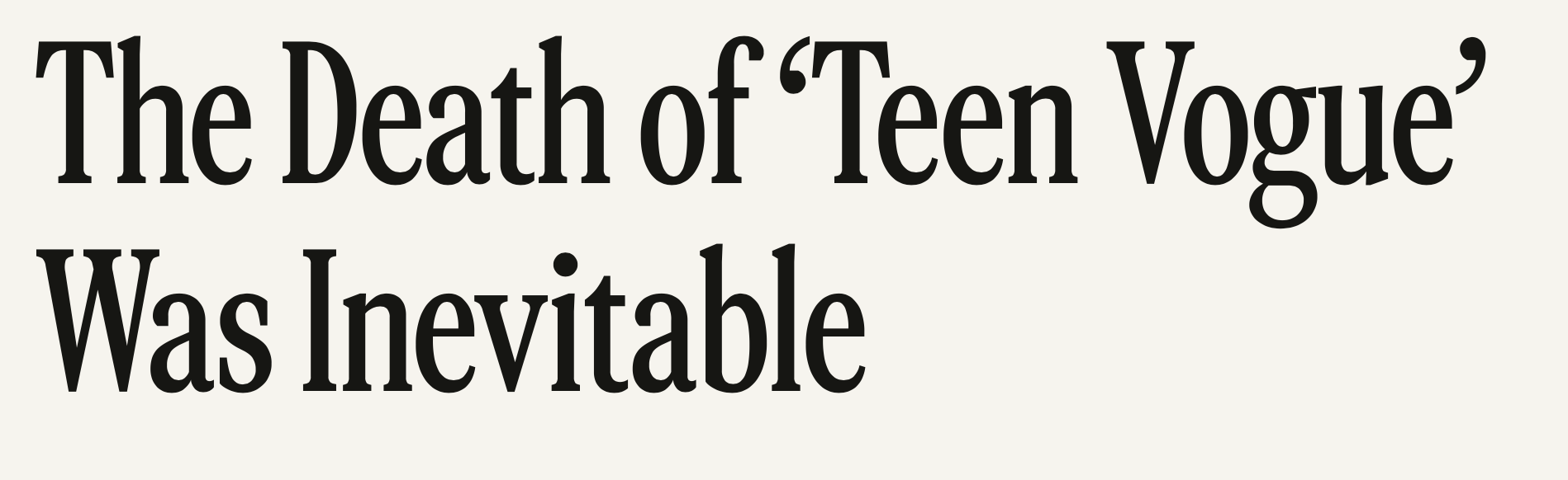 Can I write a newsletter without mentioning Vogue? I fear not, especially because it forever remains the very top of Google SEO rankings. Chloe Malle’s presence is definitely being felt - if not from the very rogue US Vogue cover of Timothée Chalamet (which is rumoured to be created by AI) - but most dominantly, from the closure of Teen Vogue last week. It was announced that the popular magazine, whose print edition closed in 2017, would be folded into Vogue.com after 22 years of running. 70% of the staff were laid off, including the editor-in-chief, Versha Sharma, and the decision has been seen not just as a business failure, but as a cultural failure.