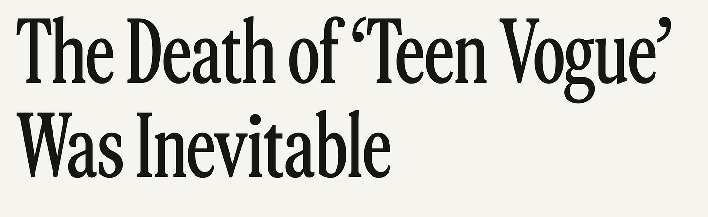 An article in The Free Press by Kat Rosenfield titled The Death of Teen Vogue was Inevitable picked at my initial thoughts, arguing that this closure reflects a broader shift in media and youth-culture dynamics. At its core, Teen Vogue was described as the “radical little sister” to Vogue, combining fashion and celebrity coverage with progressive politics and youth-oriented identity issues. It was a space where many teens could read and contribute to the growing political climate in a way that was unique to them. Readers could share what they thought about the biggest topics and how it was impacting them, not merely what the next trending accessory was.